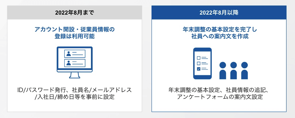 2022年08月に「ハーモス年末調整」がリリースされ次第、年末調整の基本設定や社員への案内文作成などの準備を進めてください。