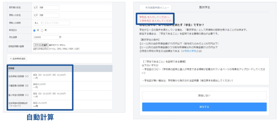 保険会社やマイナポータル経由で取得した「電子控除証明書」を入力画面でアップロードするだけで控除証明書の内容が入力され、控除額は自動計算されるので非常に便利です。