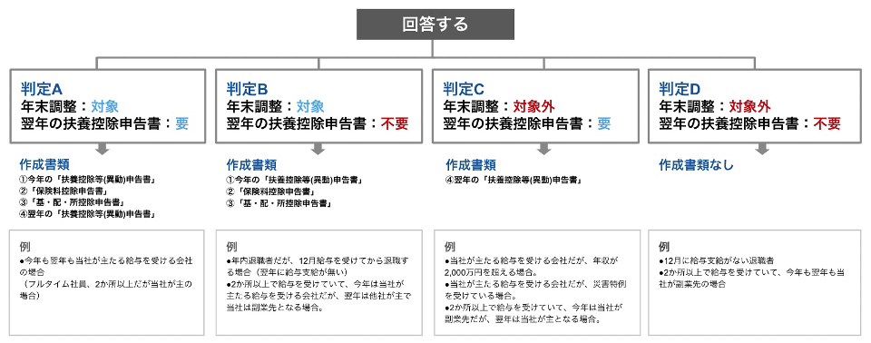 今年の年末調整対象、来年の扶養控除申告書も提出が必要な人が一番多いパターンだと思いますが、年末調整をしてから退職される方などで、年末調整はするが来年の扶養控除等申告書はいらない方の判定や、収入が2,000万円超の方などで、年末調整はしないが来年の扶養控除等申告書が必要な方の判定も行います。例えば、もし今年も来年も対象外の方に提出依頼を送ってしまったとしても、回答によって不要と判定される安心設計となっています。