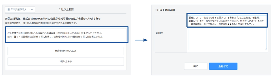 従業員の皆様に正しい情報を入力していただくために、従業員回答画面の各項目には説明文を添えることができます。