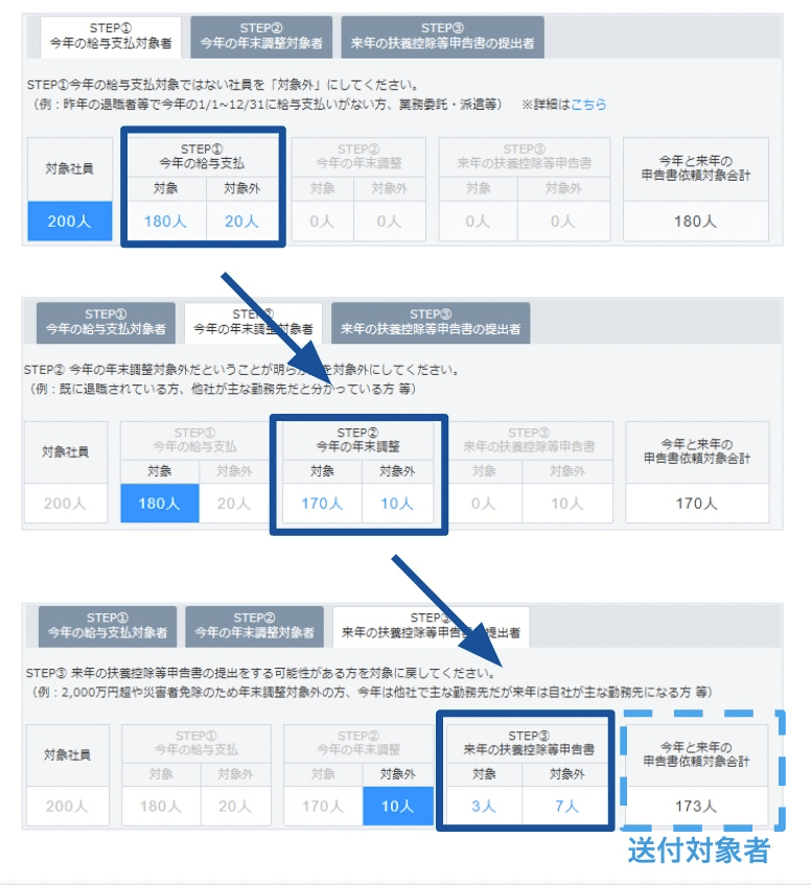 その場合でも、適切な社員に年末調整申告書の入力依頼が送付できるように、ステップを踏んで対象者を選択出来ます!