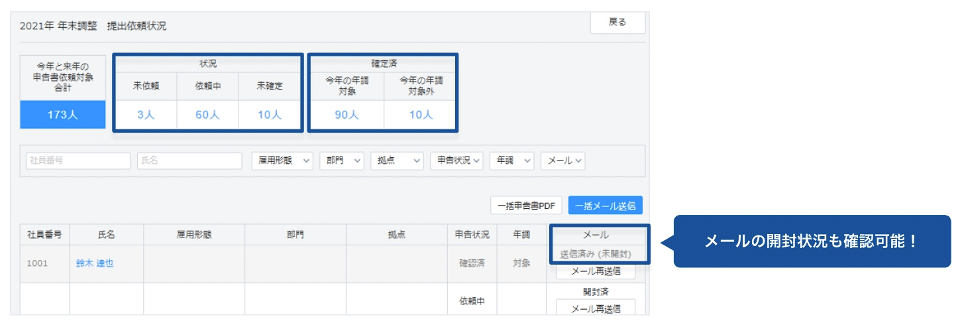 提出状況はシステム画面より一目で確認できる仕組みになっており、提出状況もリアルタイムで更新されます。また、煩わしいリマインド作業もシステム上で自動化されますので、進捗確認作業が楽になります。