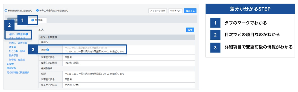 従業員が、予め入力されていた内容を変更した場合(今年と来年の申告情報の差分がある場合)は、その変更された項目に差分のマークが表示されます。差分がある項目だけ確認することで、確認作業も効率的に進めることができます。