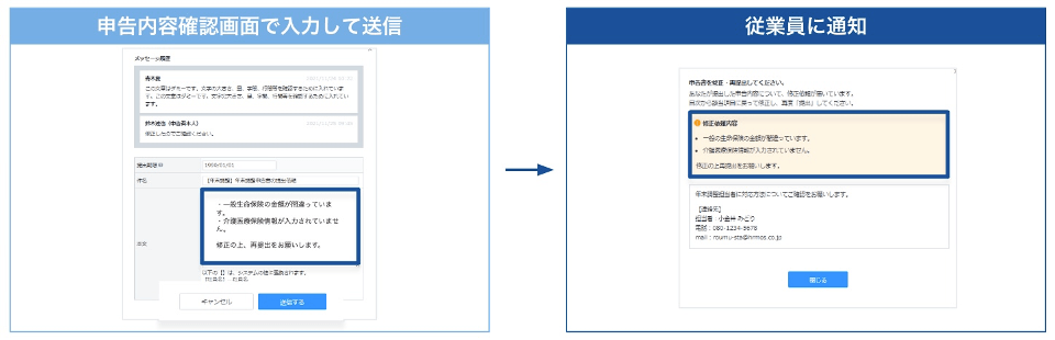修正が必要な場合は、申告内容確認画面から修正依頼のメッセージを入力し送信することができます。従業員も、修正が必要な項目で具体的な修正指示のメッセージを確認できるため、確実に修正できます。