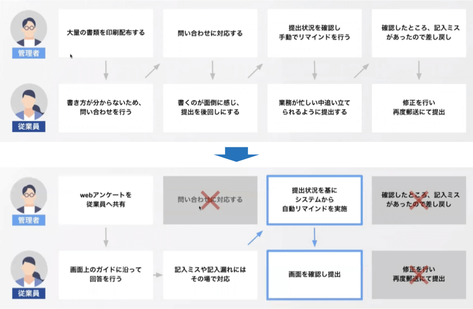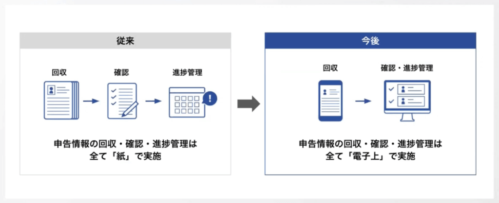 年末調整「電子化」することによって、従来は紙で回収していた情報を、パソコンやスマートフォンで回収・確認・進捗管理ができるようになります。