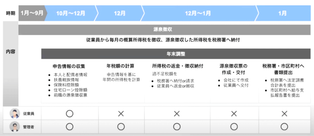 1年間の給与/賞与が決定する12月に、本来支払うべき所得税を改めて計算し、概算との差額を返金or徴収して精算を行う必要があります。この業務をまとめて「年末調整」と呼びます。
