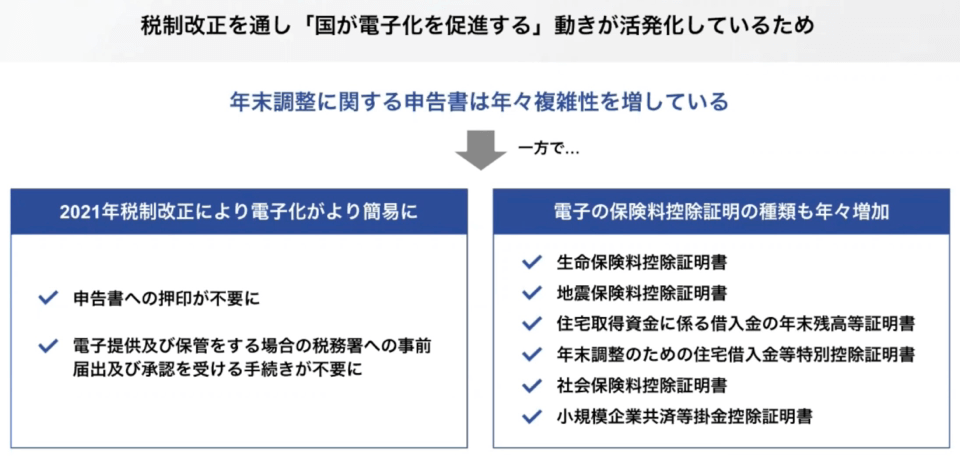 それは、税制改正を通し「国が電子化を促進する」動きが活発化していることが要因となっています。申告書への押印や税務署への事前届出など電子化を妨げていたハードルが廃止され、また、電子の保険料控除証明も年々増加している状況が後押しとなり、電子化への流れが活性化しています。