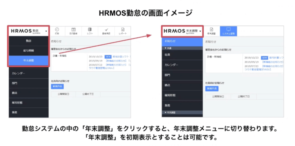 実際の運用イメージといたしましては、ハーモス勤怠の画面左上のメニューから「年末調整」の機能に切り替えていただき、ご利用いただく流れになります。