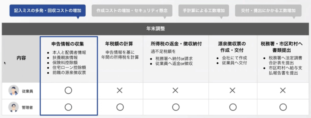 年末調整を紙で管理する上での課題は複数ありますが、最も大きな課題は、申告情報を紙で収集する工程で生じます。