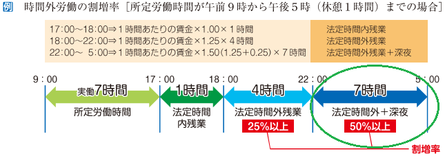 ただし、22時以降は「深夜」に係る割増率の加算が生じます。ちなみに、この「深夜」に係る割増率は「時間外」にも加算されます。