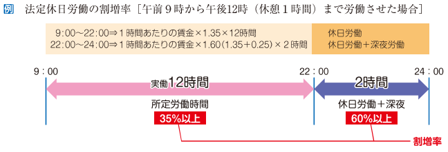 労基法上の法定休日(※)「休日」の割増賃金率については「35%」とされていますが、実務上、「休日に法定労働時間を超えて労働した場合、「休日」+「時間外」で割増賃金率は60%となるのでしょうか?」というご質問を受けることがあります。