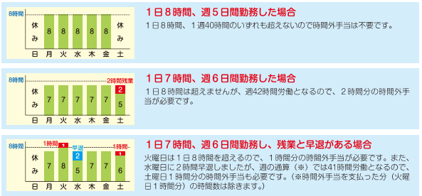 「時間外」について、「1日8時間超」の要件は比較的分かりやすいですが、「週40時間超」については盲点になりやすく、実務上も未払賃金の温床となりやすいポイントです。