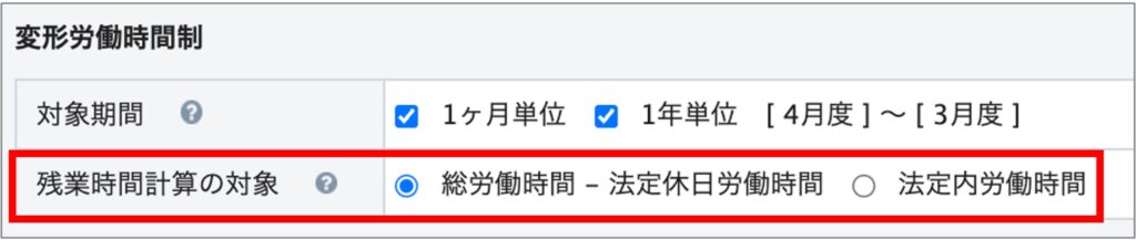[システム管理>勤怠設定>勤務形態タブ]画面の「残業時間計算の対象」の項目における「総労働時間ー法定休日労働時間」と「法定内労働時間」の違いについてご説明します。