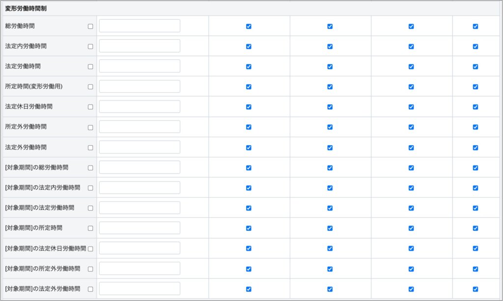 [システム管理>日次勤怠 項目設定]画面の、「変形労働時間制」にて必要な項目をチェックしてください。