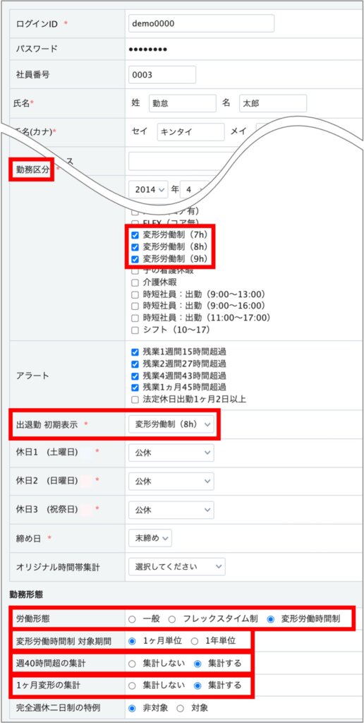 ・勤務区分:手順3で作成した変形労働時間制用の勤務区分にもチェック