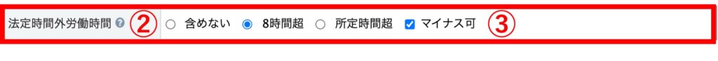 ①の法定時間外労働時間の項目:「所定時間超」を選択