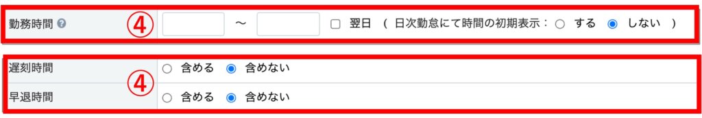 フレックスタイム制の場合、④の勤務時間の項目は空欄にし、④遅刻時間・早退時間の項目は「含めない」を選択します。