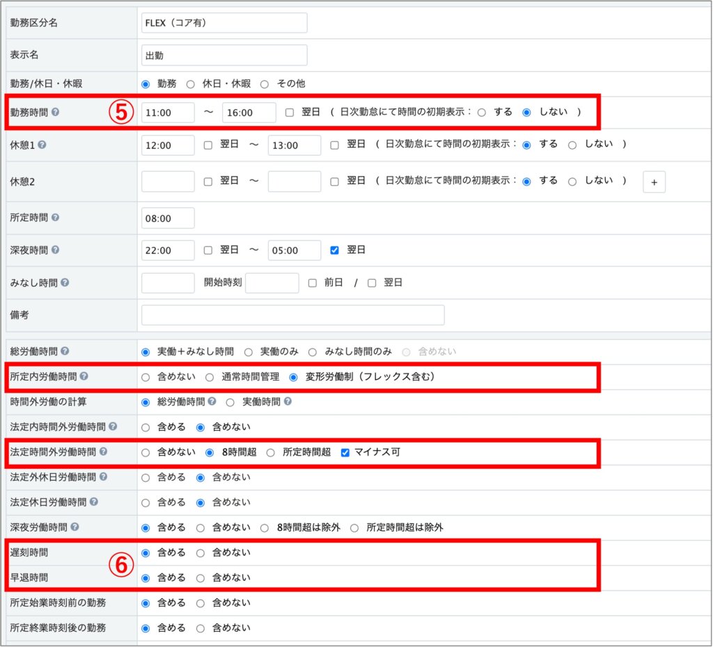 コアタイムに遅刻・早退した時は遅刻早退時間として集計したい場合は、⑤の勤務時間の項目にコアタイムを入力し、⑥遅刻時間・早退時間の項目は「含める」という設定をします。