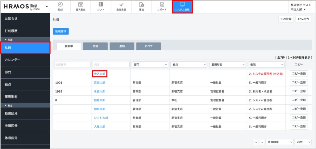 [システム管理>社員]の画面より、フレックスタイムの社員の設定を行います。まず、フレックスタイムで働く社員を選択します。