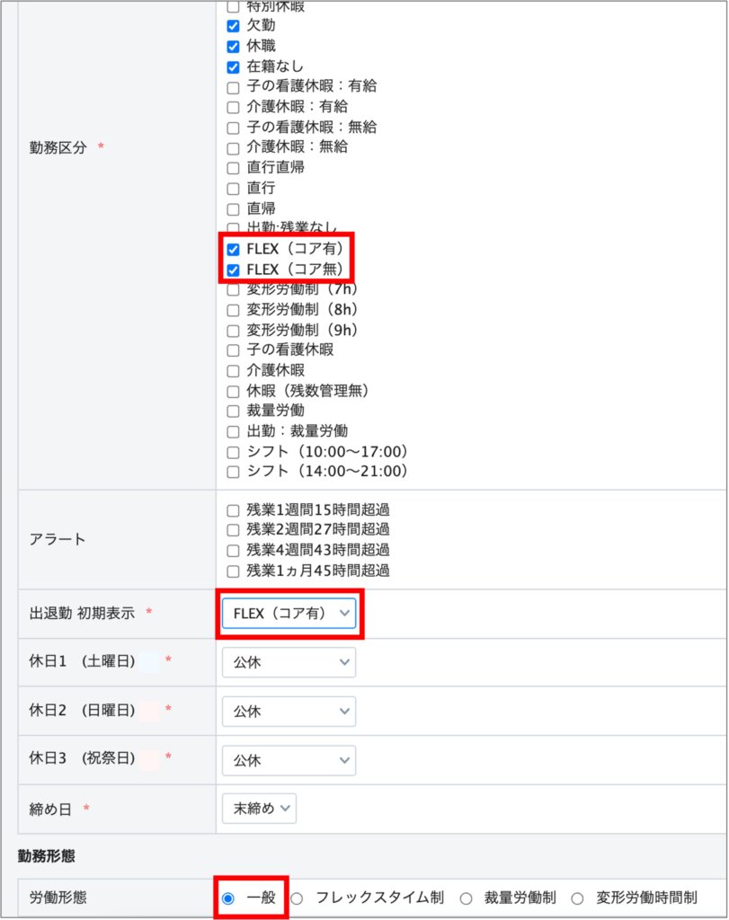 編集画面へ遷移し、「勤務区分」の項目で先程作成したフレックスタイム制用の勤務区分を追加します。また、「出退勤 初期表示」の項目でもフレックスタイム制用の勤務区分を選択します。なお、運用①の場合、労働形態は「一般」と設定します。