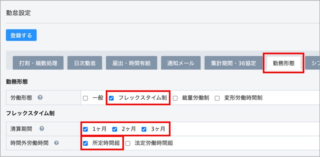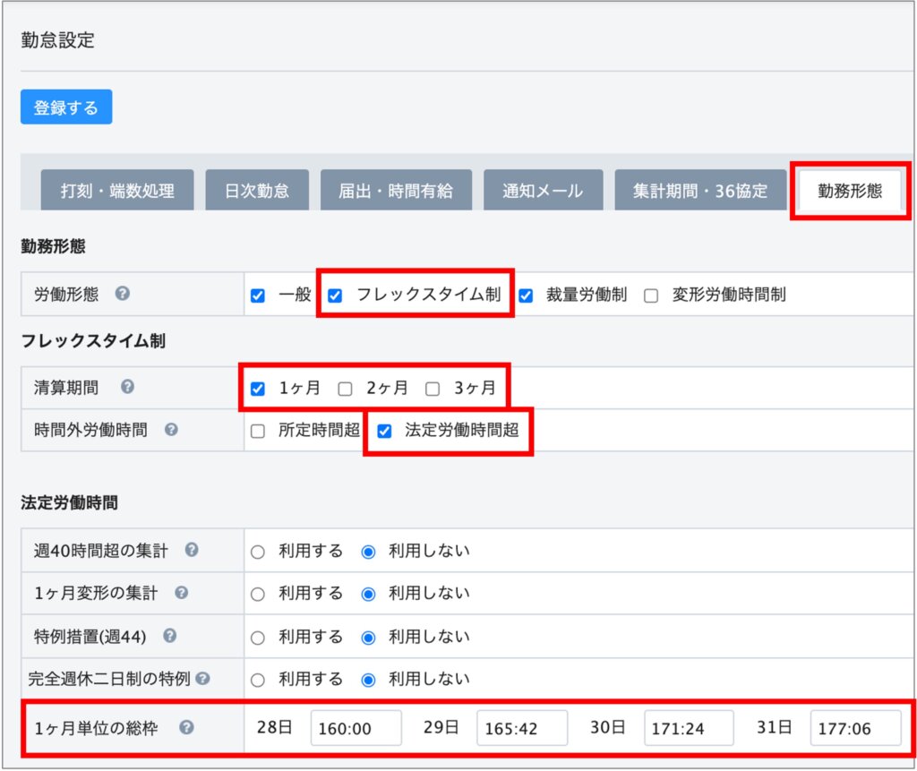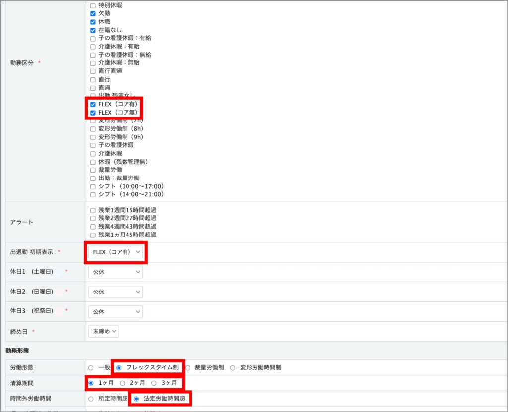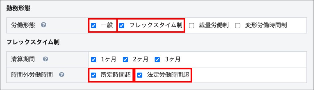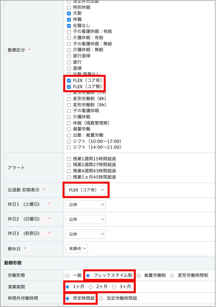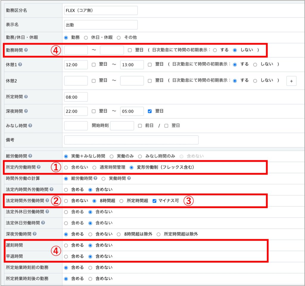 フレックスタイム制の場合、②の法定時間外労働時間の項目の、「マイナス可」にチェックを入れることをおすすめします。