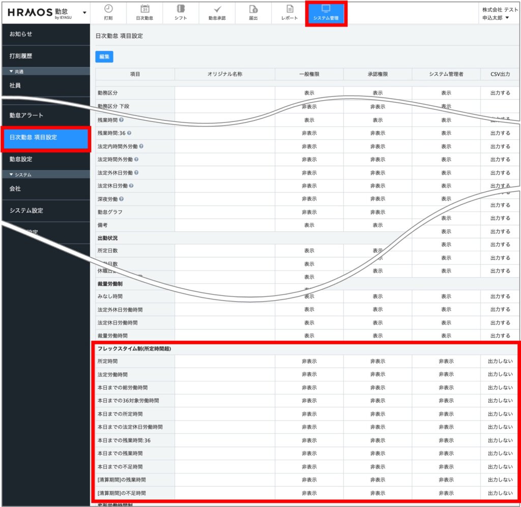 [システム管理>日次勤怠 項目設定]の画面より、日次勤怠画面で表示させる項目を選択します。「フレックスタイム制(法定労働時間超)」の項目群にチェックを入れてください。