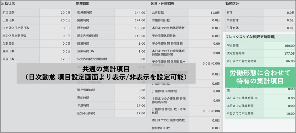 [システム管理>勤怠設定>勤務形態タブ]の画面の「労働形態」の項目で「フレックスタイム制」「裁量労働制」などの労働形態を選択することによって、日次勤怠場面下部にその労働形態特有の集計結果が表示されるようになります。