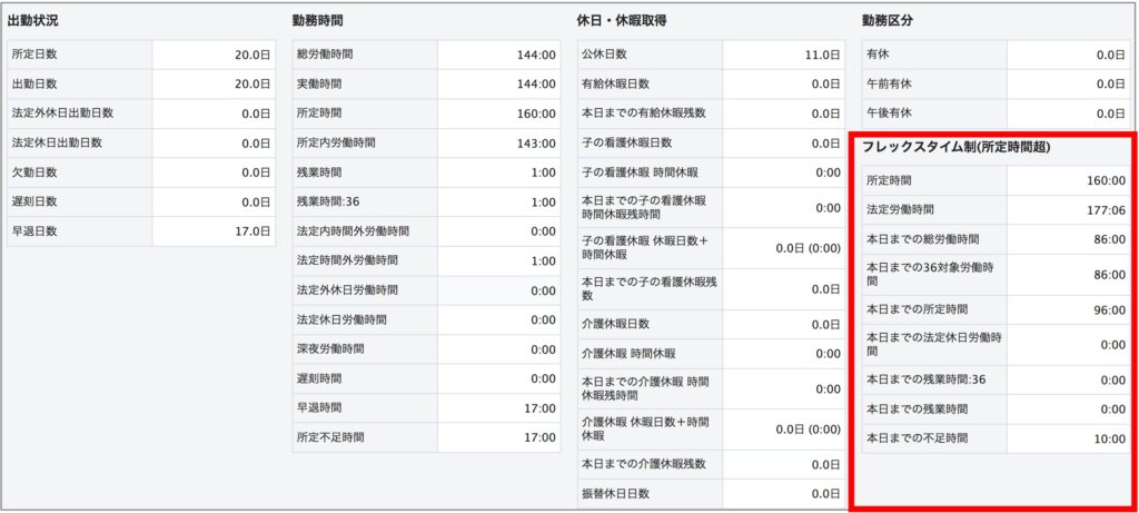 運用②の場合、[システム管理>勤怠設定>勤務形態タブ]の画面の「労働形態」は「フレックスタイム制、法定労働時間超」と設定するため、日時勤怠画面の右下に「フレックスタイム制(法定労働時間超)」の集計項目が表示されます。