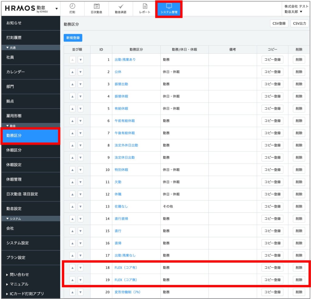 [システム管理>勤務区分]の画面より、フレックスタイム用の勤務区分を作成します。デフォルトで「FLEX(コア有)」「FLEX(コア無)」という勤務区分が登録されておりますので、こちらを自社に適した設定に変更していただければスムーズに設定できるかと思います。