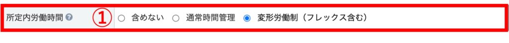 フレックスタイム制の場合、①の所定内労働時間の項目では、「変形労働制(フレックス含む)」を選択します。