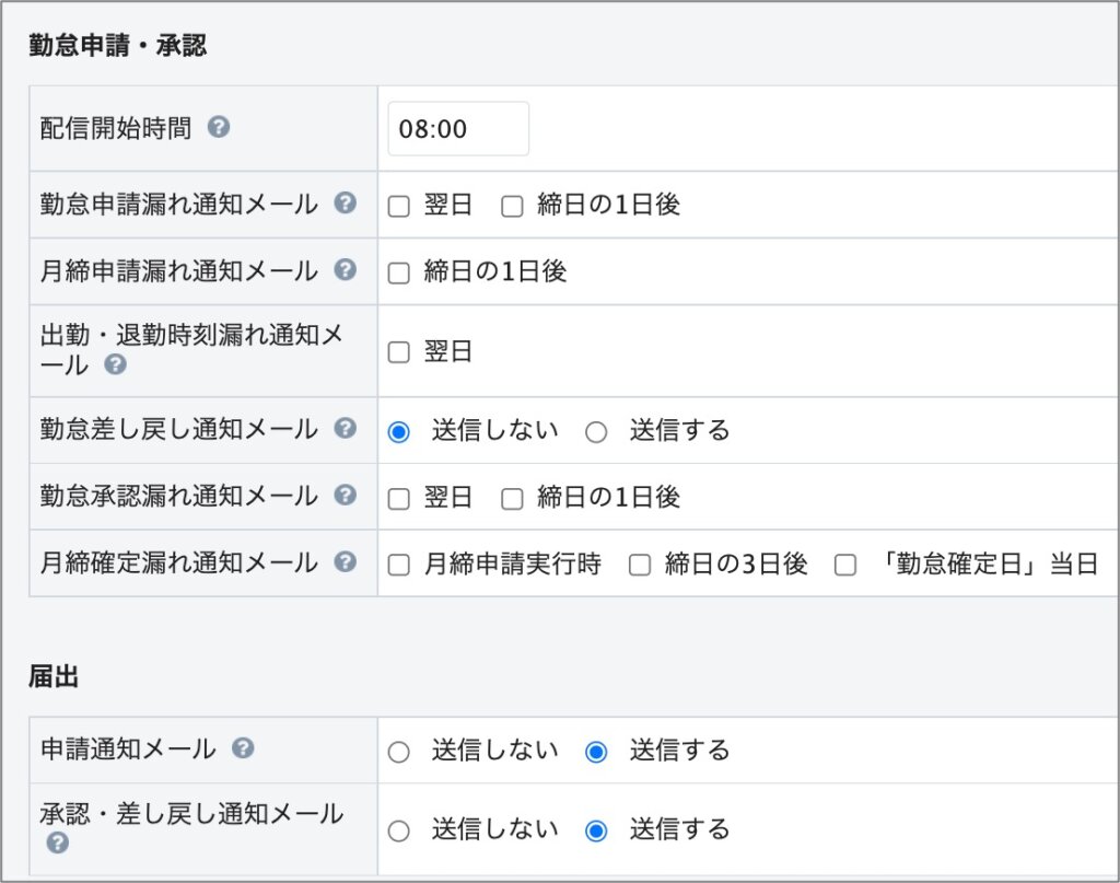 勤怠申請・承認についての通知メール設定がこちらでできます。