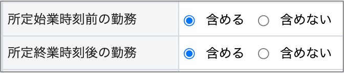こちらの設定を「含める」から「含めない」に変更してください。本設定をすることにより、終業時刻前の勤務時間を集計対象から外すことができます。また、同様に「所定終業時刻後の勤務」も設定が可能です。