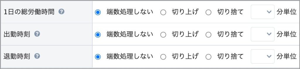 「1日の総労働時間」「出勤時刻」「退勤時刻」について端数処理が可能です。