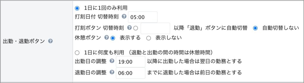 「1日に1回のみ打刻」するのか「1日に何度も打刻」するのかを選択できます(特殊な職種でない限り「1日に1回のみ打刻」を推奨しております)。