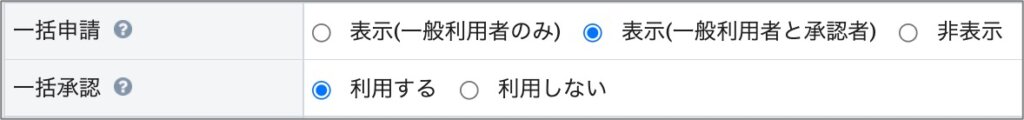 しかし、どうしても運用が追いつかない「移行期間」もあるかと存じます。そこで「日次勤怠設定」にて一括申請・承認の利用を許可することができます。一括申請では「表示」を、一括承認では「使用する」を選択してください。