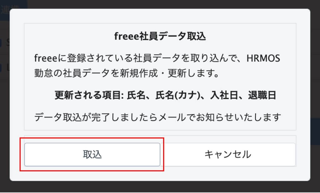 表示されたメッセージにて「取込」ボタンを押すと、人事労務freee側から、