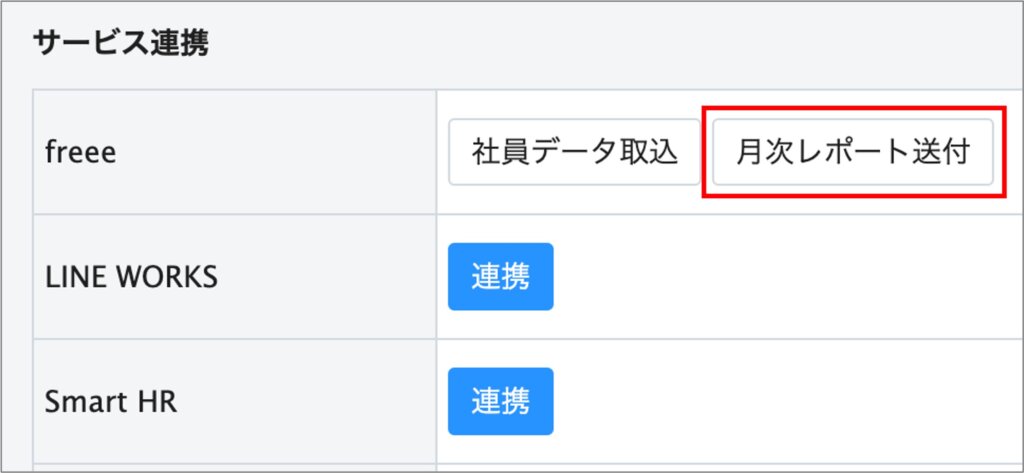 システム管理者のアカウントでハーモス勤怠へログイン後、システム管理>システム設定>サービス連携>freee の項目より「月次レポート送付」ボタンを選択してください。