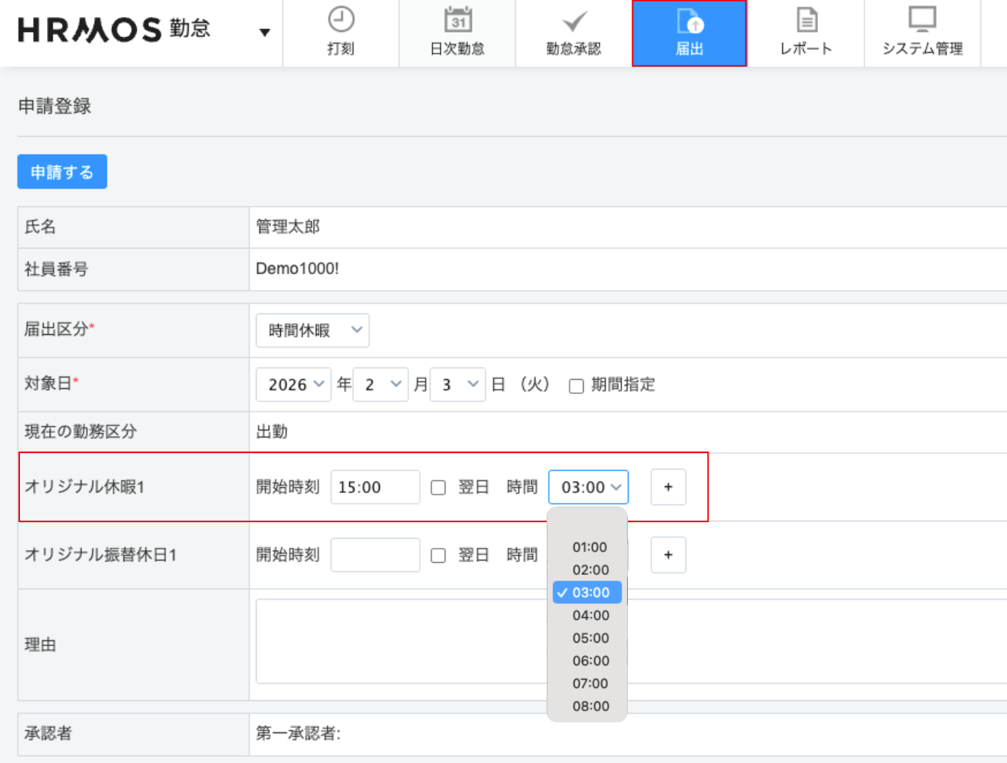 申請から承認までスムーズに: 日次勤怠画面からの入力だけでなく、「届出申請ワークフロー」を用いて時間単位の休暇を申請することも可能。