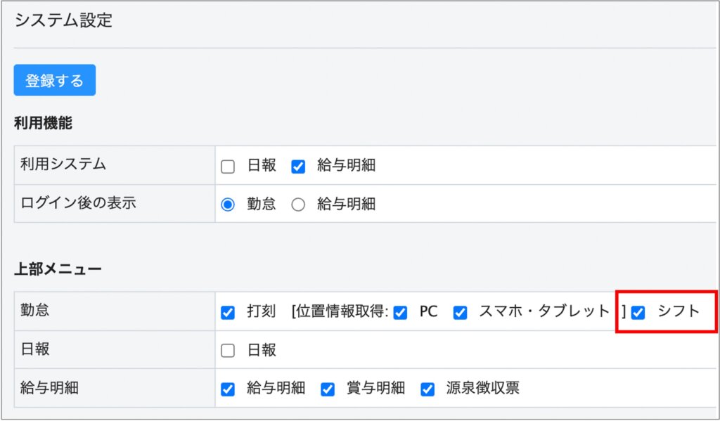 「上部メニュー」の「勤怠」の項目にある「シフト」のボックスにチェックを入れます。