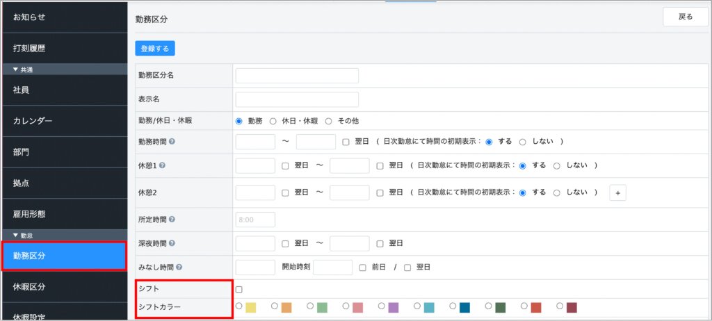 ここにチェックを入れることで、勤怠区分を新規作成する際、「シフト」「シフトカラー」が表示されるようになります。