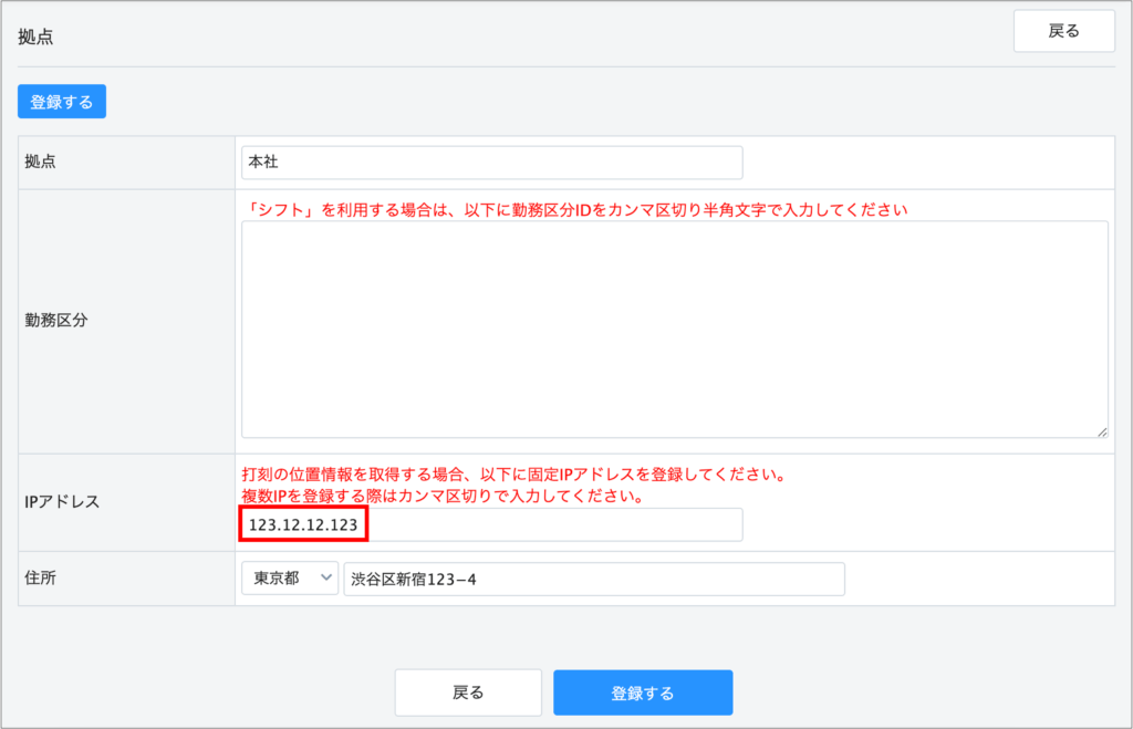 2.編集画面の「IPアドレス」に打刻拠点で使用するPC端末の固定IPアドレスを設定する