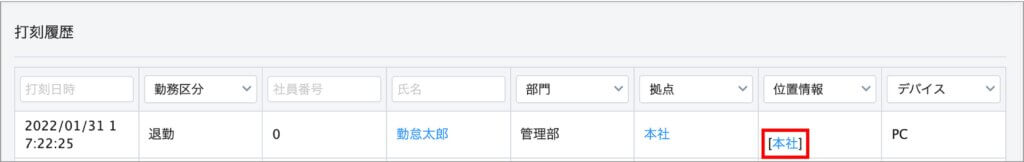 打刻履歴を確認すると位置情報にIPアドレスを登録した拠点名「本社」が表示されます。
