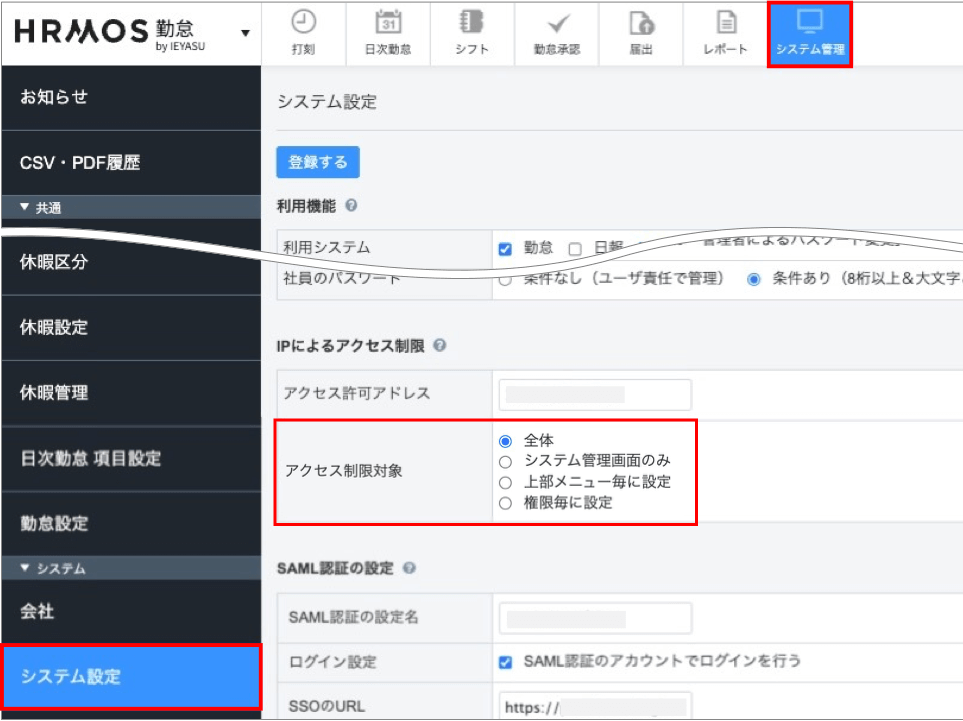 システム管理者権限の従業員は通常システム管理画面へアクセスできますが、この設定の場合、登録された固定IPアドレス以外のネットワークからでは、システム管理画面へアクセスできなくなります。