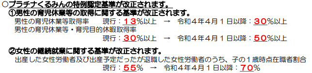「くるみん」「プラチナくるみん」の新たな認定基準は厚生労働省のリーフレットに記載されている通りですが、本稿では、2022年4月より変更されるポイントをまとめておきます。