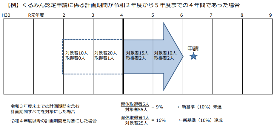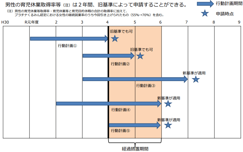 男性の育休取得率等については、2年間、旧基準によって申請することができることとなります。ただし、新基準施行となる2022年4月以前に行動計画期間が始まり、2024年3月31日までに申請することがポイントです。