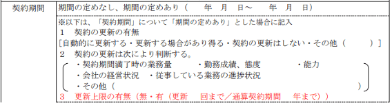 有期労働契約の締結時と更新時には、「更新上限」に関わる内容を明記することになります。これまで、有期労働契約締結・更新時には「契約期間」と「契約更新の有無」、「契約更新の判断基準」を明示することとなっていましたが、これに加えて「更新上限の有無」、上限がある場合の「更新回数または通算契約期間の上限」を記載することとされます。