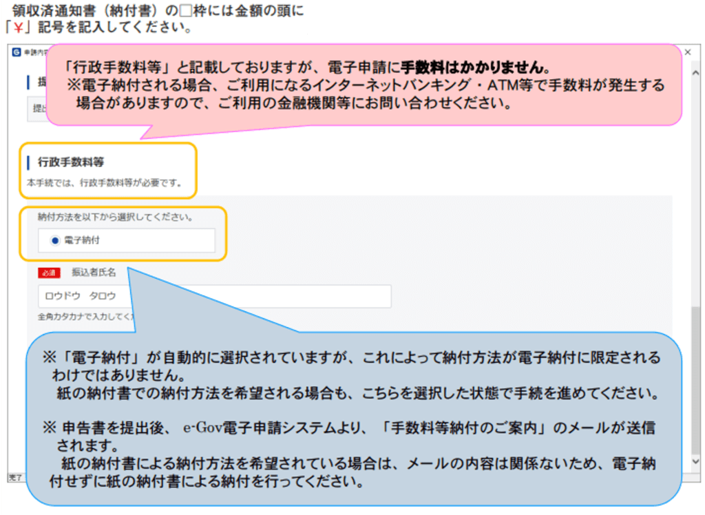 電子申請画面では「電子納付」にチェックがついていますが、電子申請であっても、納付書を使った納付が可能です。その場合、申請画面上は「電子納付」としたまま、労働局よりお手元に届いた申告書についている納付書に必要事項を記入の上、切り離して金融機関で納付します。