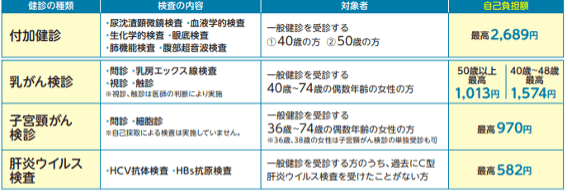 上記は「一般健診」、及び一般健診とは別に単独で受診できる「子宮頸がん検診」の内容です。このうち「一般健診」については、希望に応じて以下の付加健診を追加することもできます。付加健診部分については、労働者負担として問題ありません。