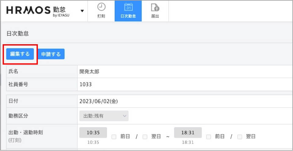 修正する際には、日次勤怠編集画面にある「編集する」ボタンをクリックします。