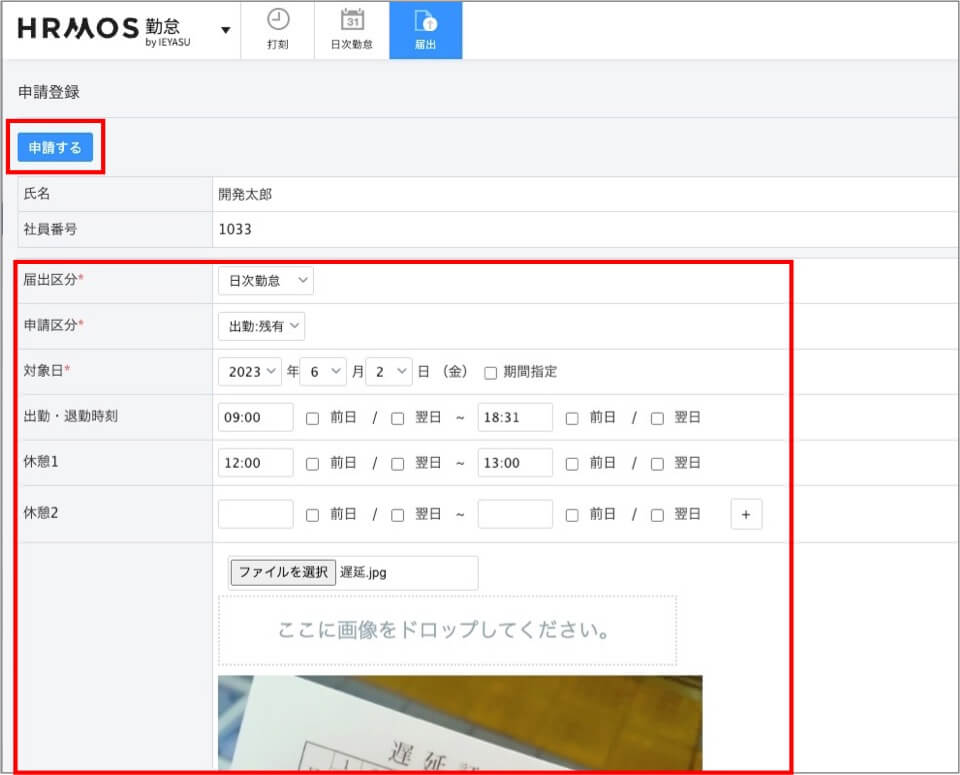 勤怠データ修正の届出申請画面に遷移しますので、修正内容を入力し、「申請する」ボタンをクリックします。
